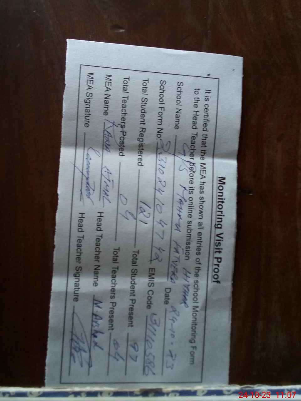| Attendance Register | Head Teacher | MEA with School | Visit Proof |