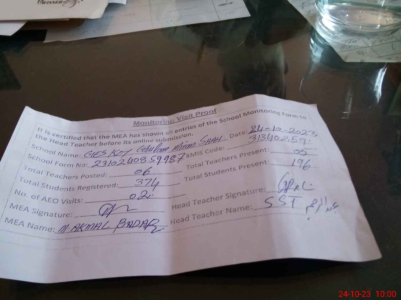 | Attendance Register | Head Teacher | MEA with School | Visit Proof |