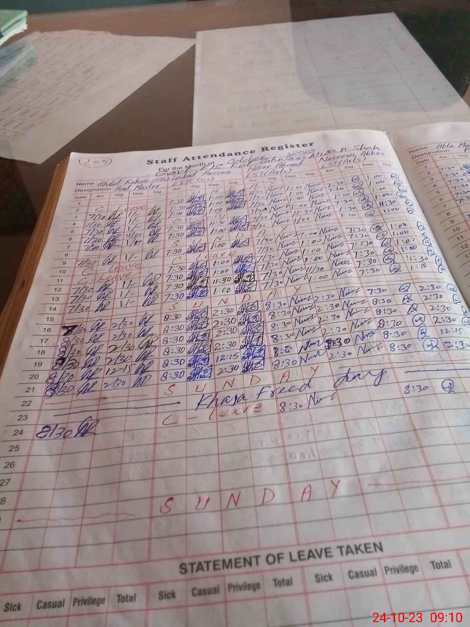 | CNIC | Full Name | Designation | R/C | Absence During Last Calender Month |