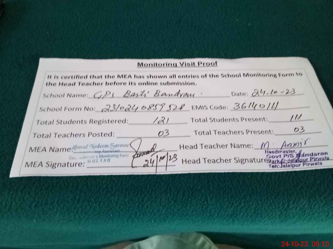 | Attendance Register | Head Teacher | MEA with School | Visit Proof |