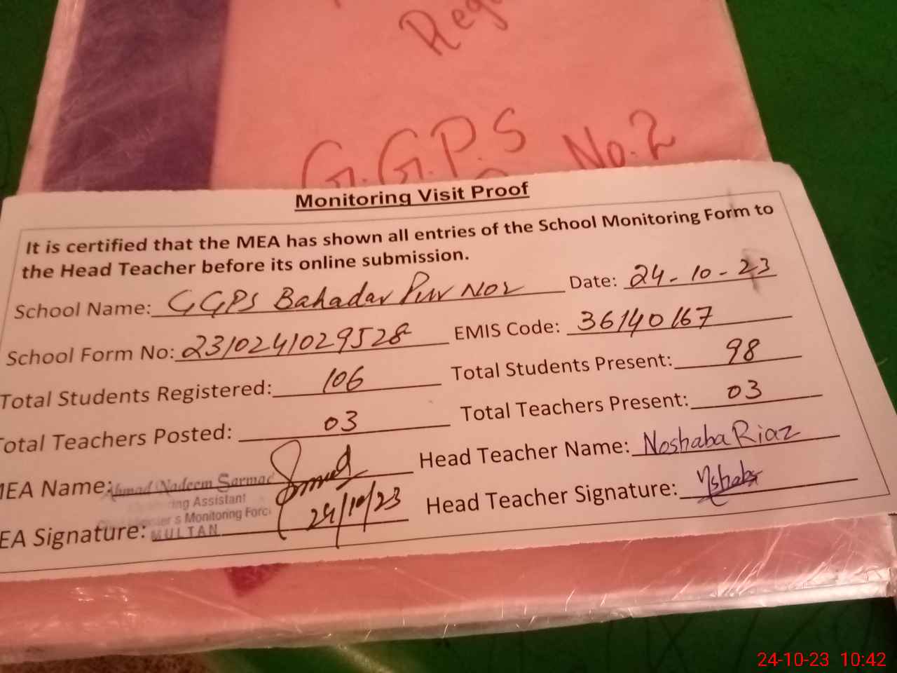 | Attendance Register | Head Teacher | MEA with School | Visit Proof |