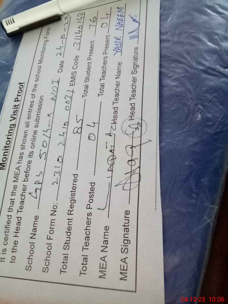 | Attendance Register | Head Teacher | MEA with School | Visit Proof |