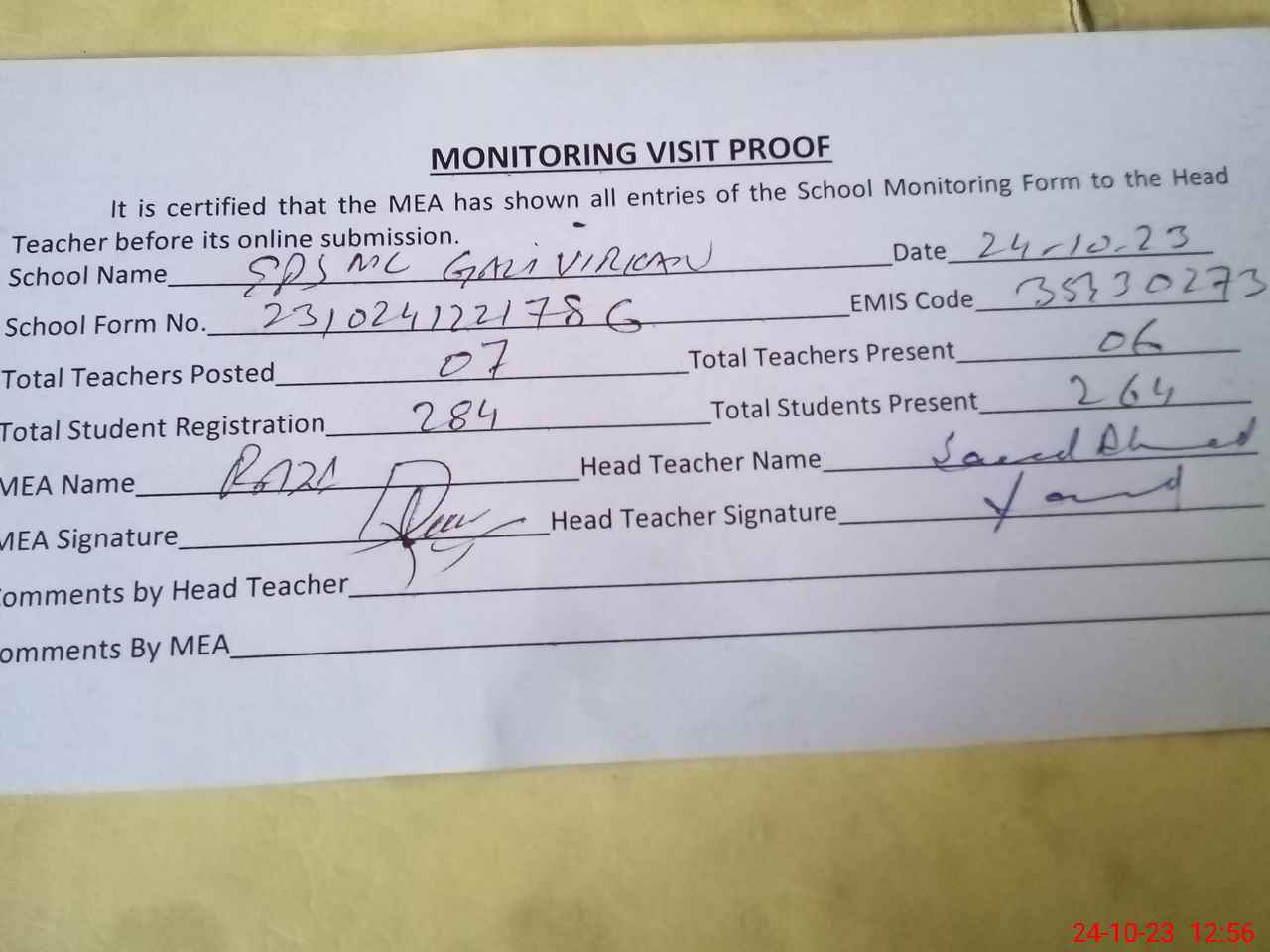 | Attendance Register | Head Teacher | MEA with School | Visit Proof |