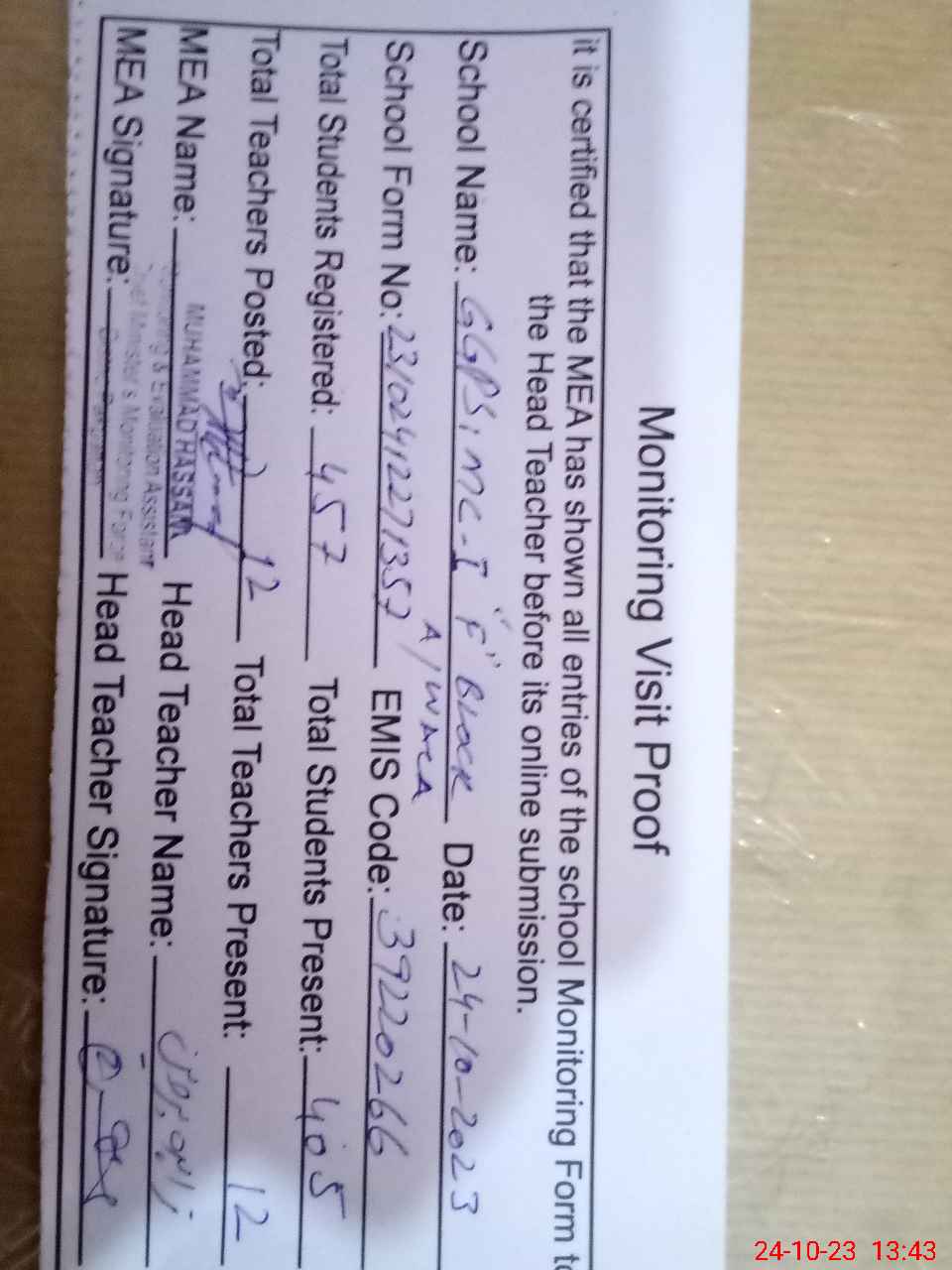 | EMIS Code: 39220266 | Name of School: GGPS MC NO. 1 F BLOCK ARIF WALA | |||