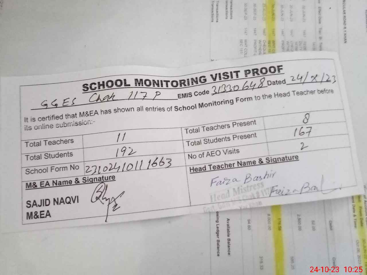 | Attendance Register | Head Teacher | MEA with School | Visit Proof |