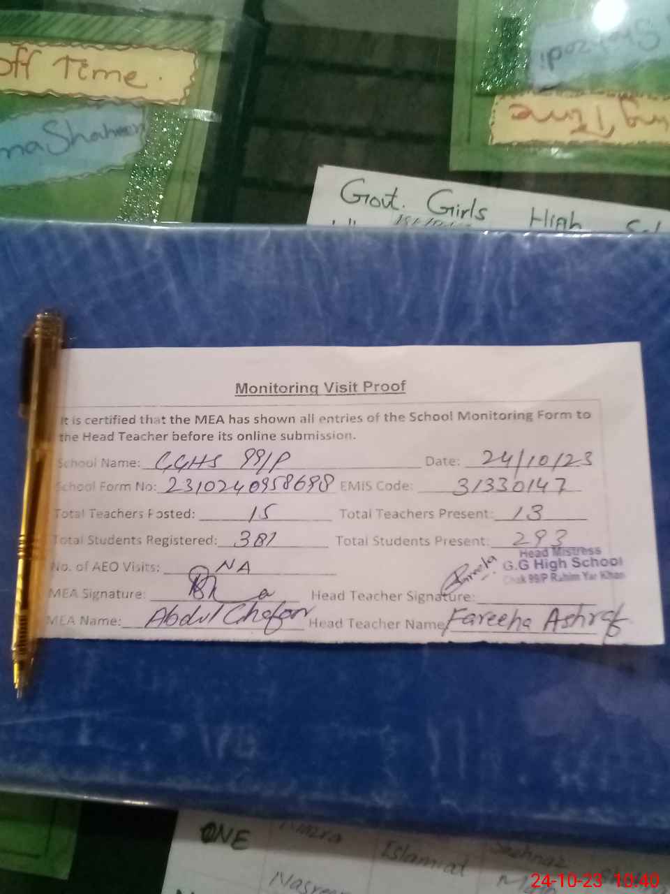 | Attendance Register | Head Teacher | MEA with School | Visit Proof |
