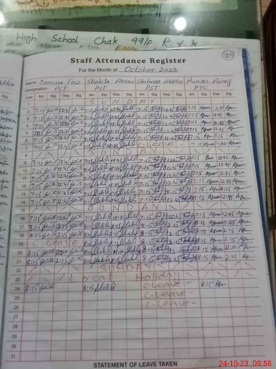 | CNIC | Full Name | Designation | R/C | Absence During Last Calender Month |
