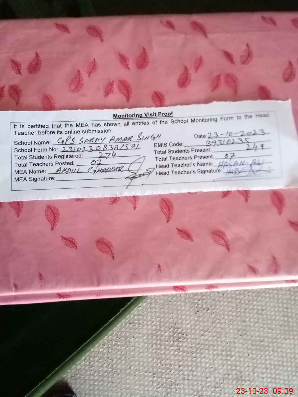 | Attendance Register | Head Teacher | MEA with School | Visit Proof |