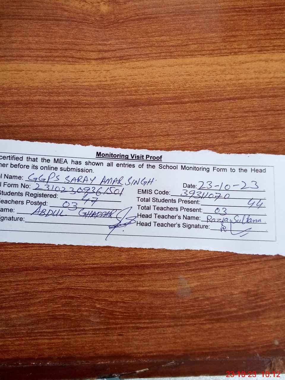 | Attendance Register | Head Teacher | MEA with School | Visit Proof |