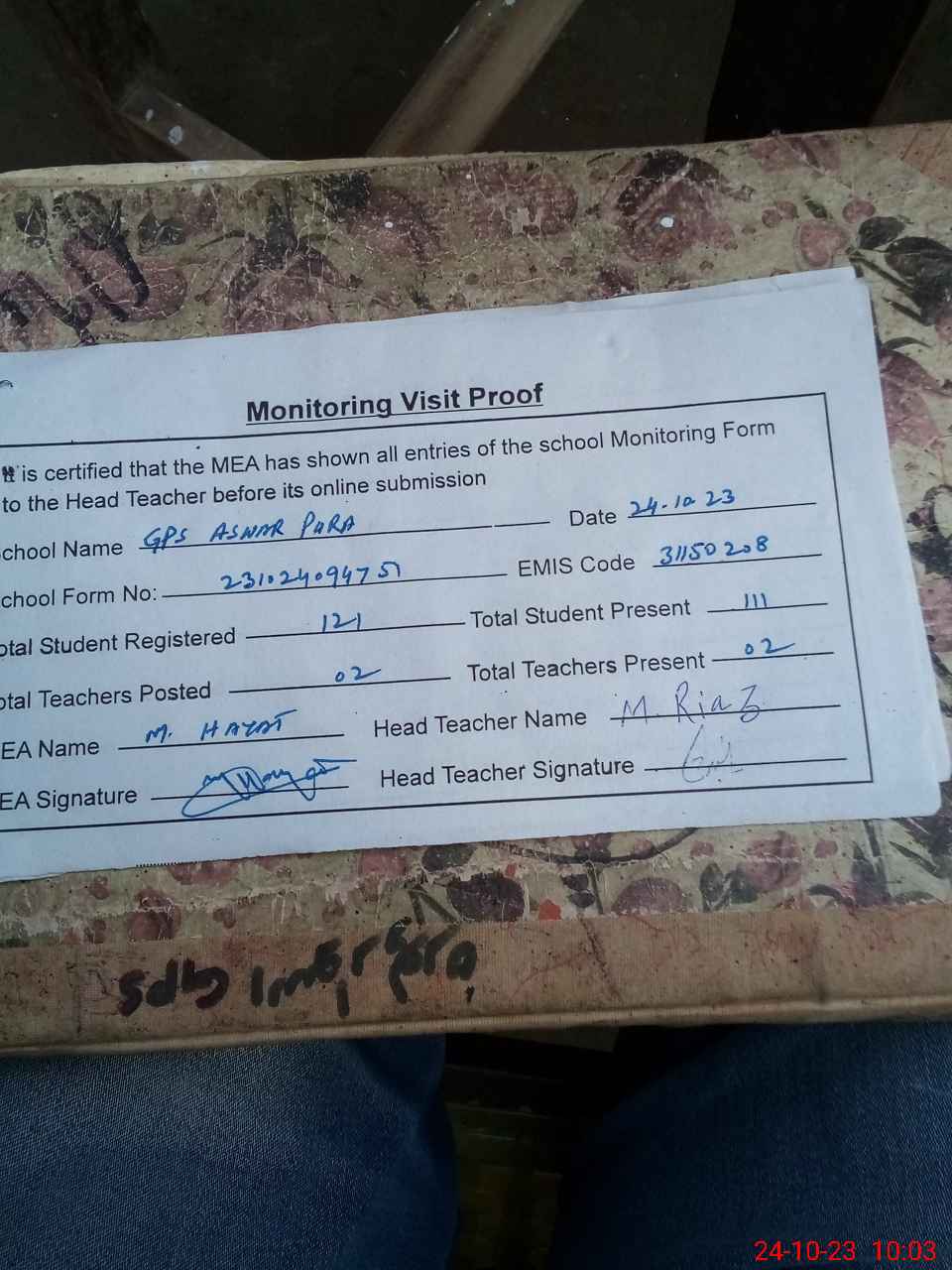 | Attendance Register | Head Teacher | MEA with School | Visit Proof |