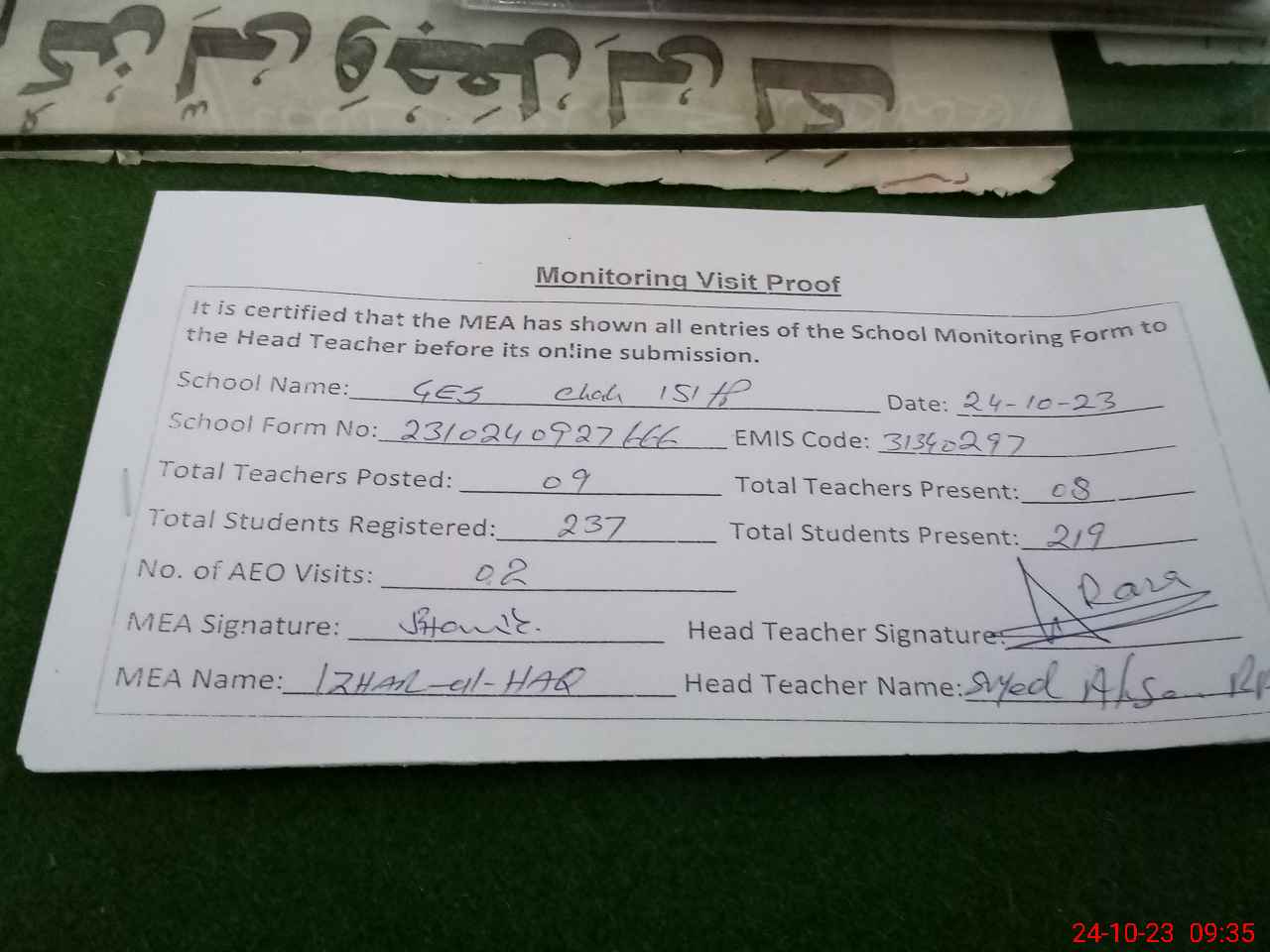 | Attendance Register | Head Teacher | MEA with School | Visit Proof |