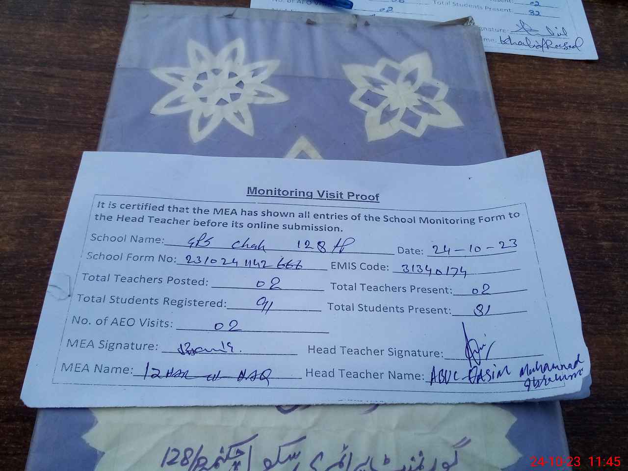 | Attendance Register | Head Teacher | MEA with School | Visit Proof |