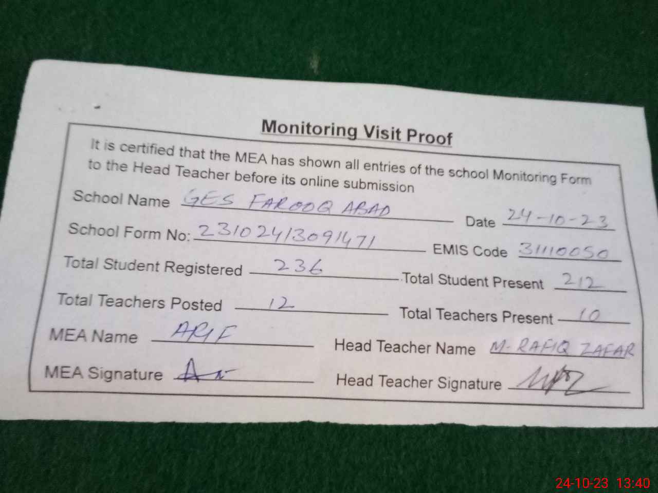 | EMIS Code: 31110050 | Name of School: GES FAROOQ ABAD | |||