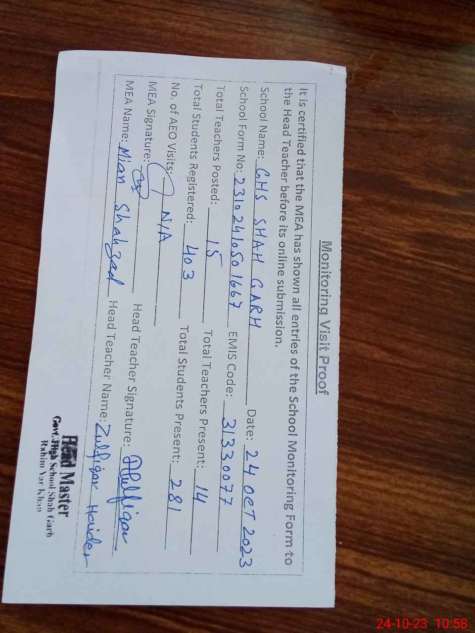 | Attendance Register | Head Teacher | MEA with School | Visit Proof |