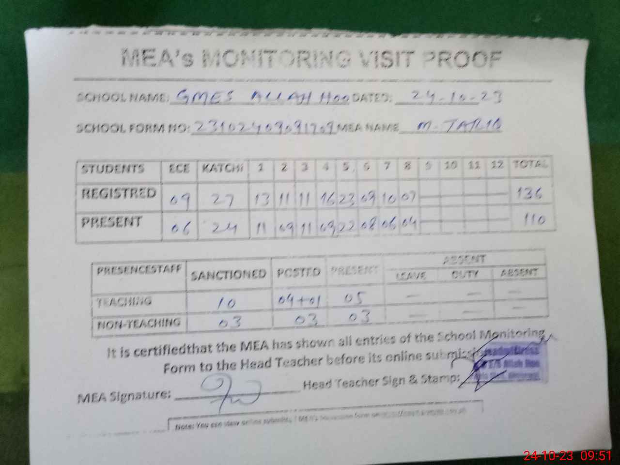 | Attendance Register | Head Teacher | MEA with School | Visit Proof |