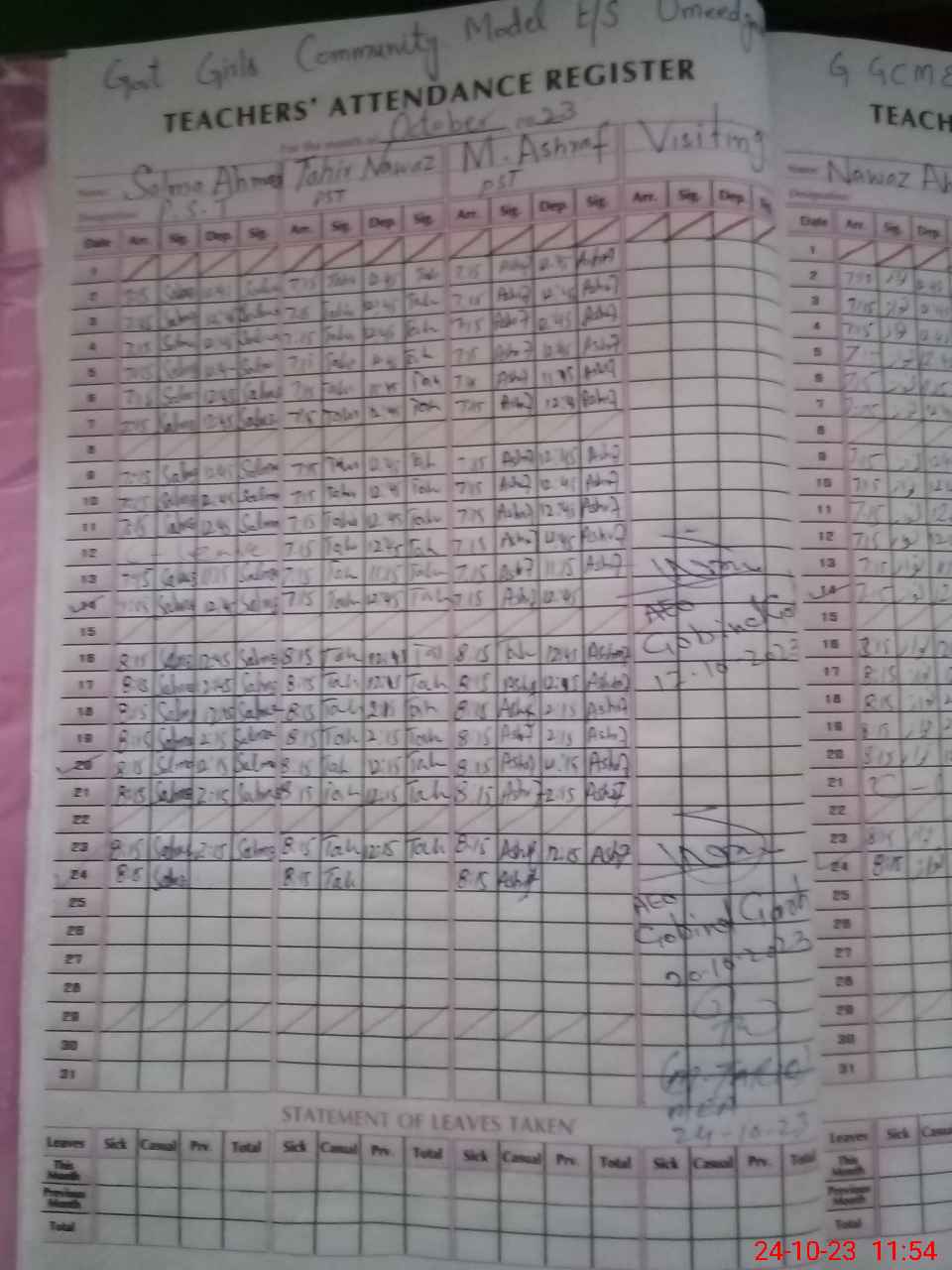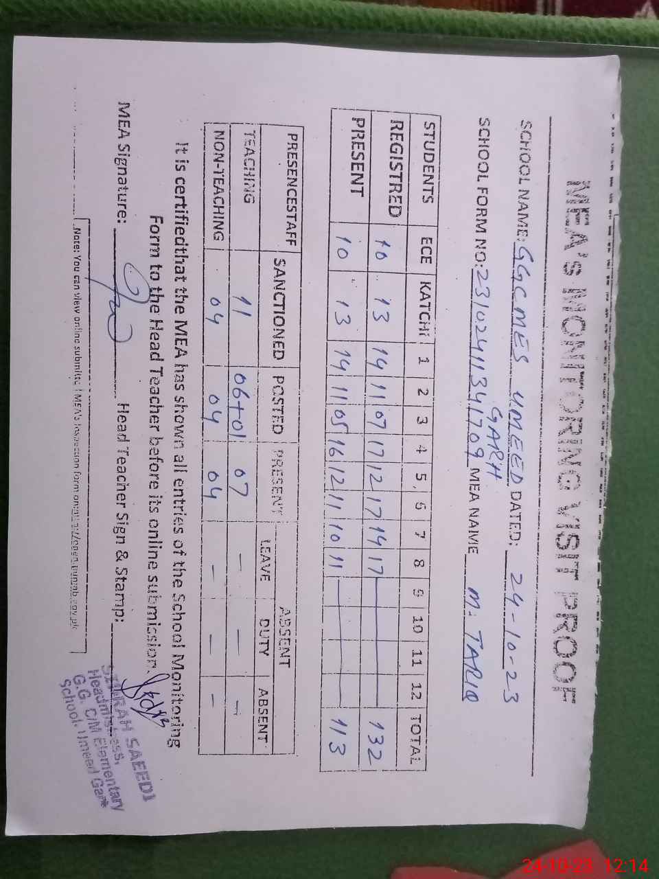 | Attendance Register | Head Teacher | MEA with School | Visit Proof |