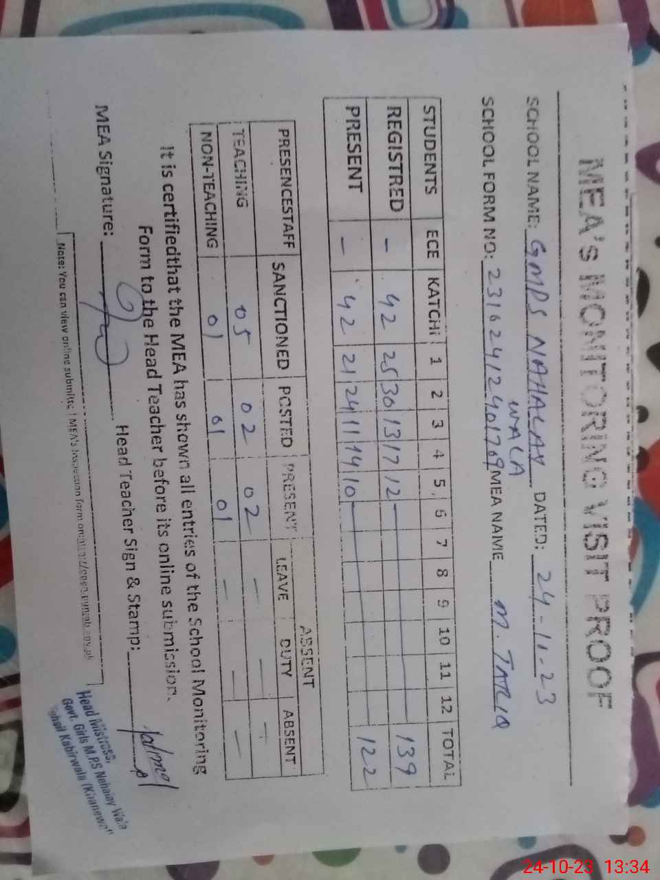 | Attendance Register | Head Teacher | MEA with School | Visit Proof |