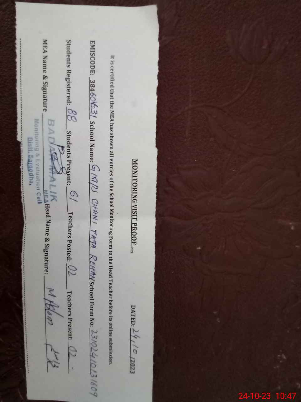 | Certified that this School was Inspected by the Undersigned MEA/DMO Today and the Information Stated Above is as Per Record. | |||||