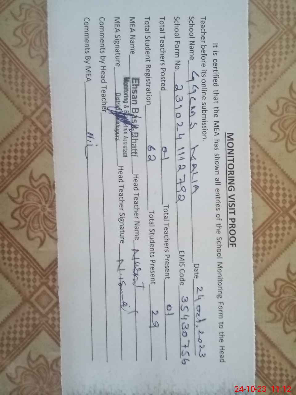 | Attendance Register | Head Teacher | MEA with School | Visit Proof |
