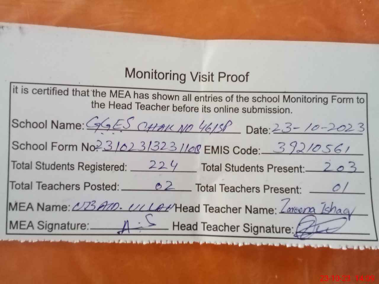 | Attendance Register | Head Teacher | MEA with School | Visit Proof |