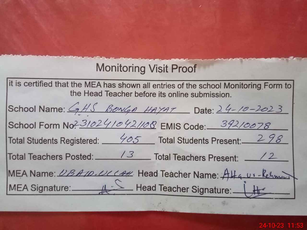 | EMIS Code: 39210078 | Name of School: GHS BUNGA HAYAT | |||