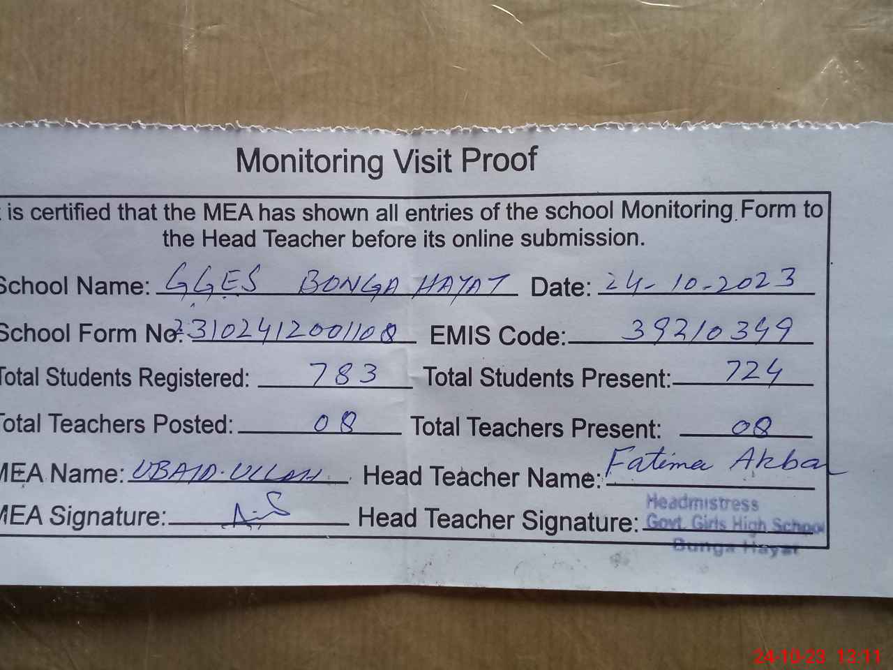 | Certified that this School was Inspected by the Undersigned MEA/DMO Today and the Information Stated Above is as Per Record. | |||||