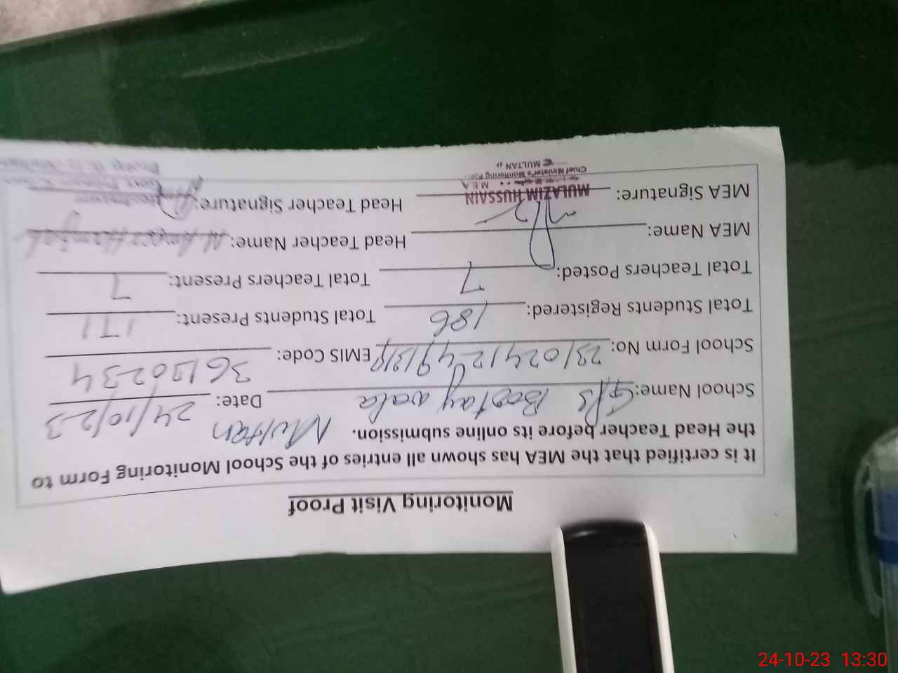 | Certified that this School was Inspected by the Undersigned MEA/DMO Today and the Information Stated Above is as Per Record. | |||||