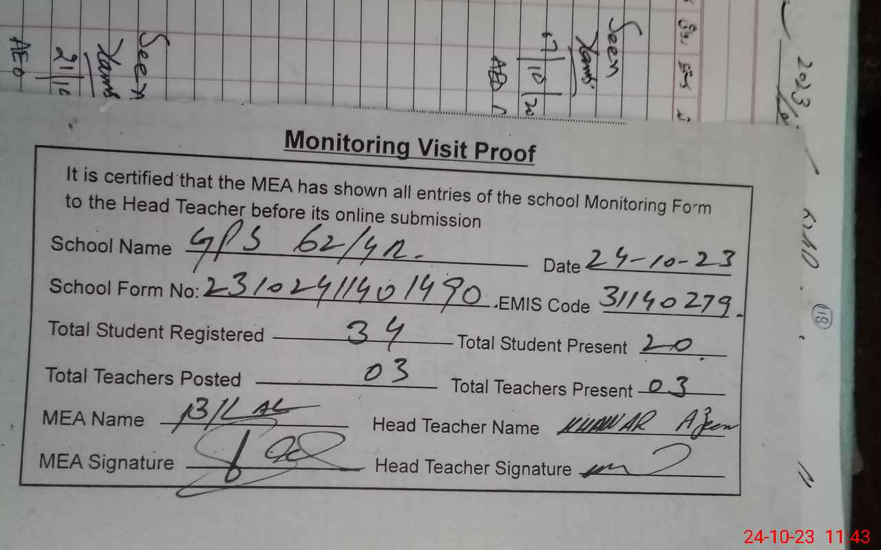| Attendance Register | Head Teacher | MEA with School | Visit Proof |