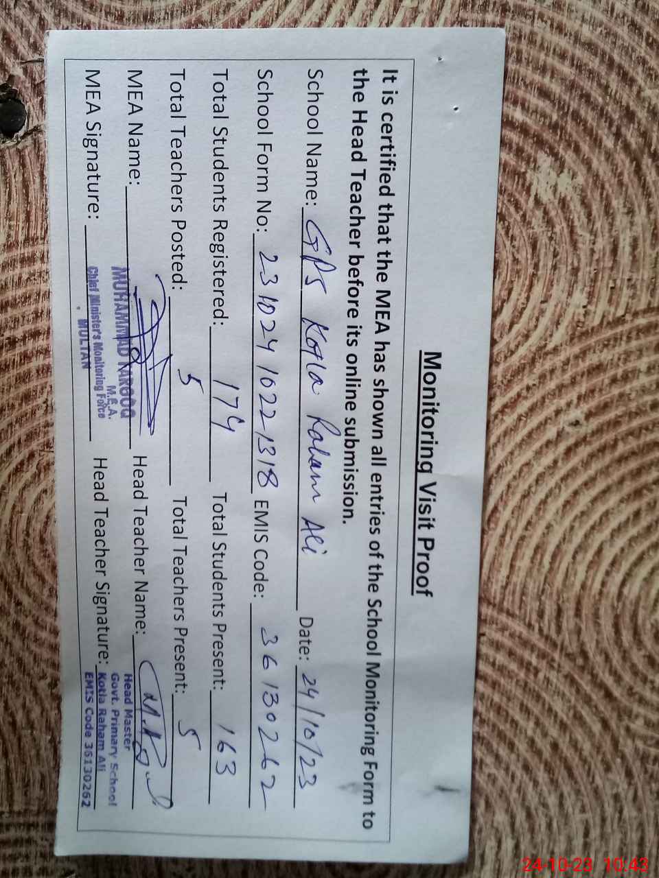 | EMIS Code: 36130262 | Name of School: GPS KOTLA RAHAM ALI LAR MULTAN | |||