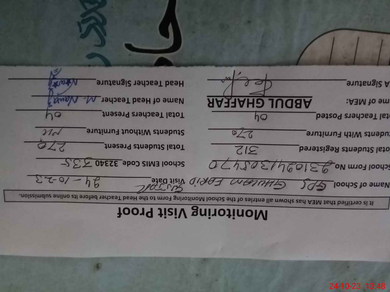 | Certified that this School was Inspected by the Undersigned MEA/DMO Today and the Information Stated Above is as Per Record. | |||||