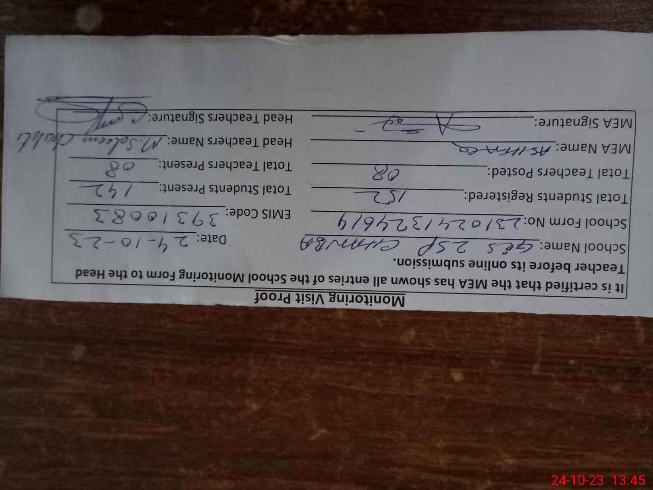 | Attendance Register | Head Teacher | MEA with School | Visit Proof |
