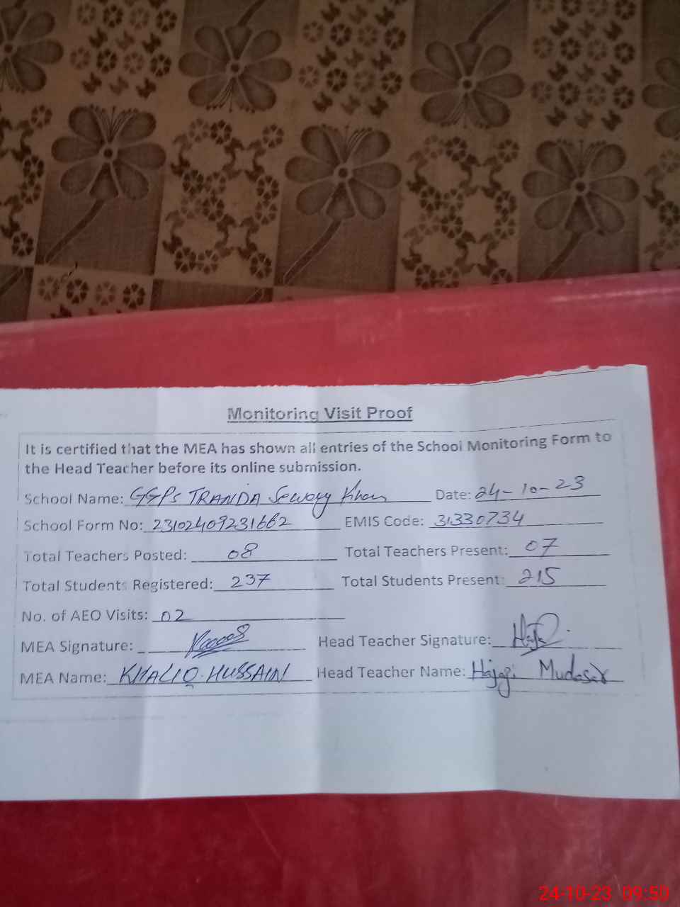 | EMIS Code: 31330734 | Name of School: GGPS TRINDA SAWAY KHAN | |||