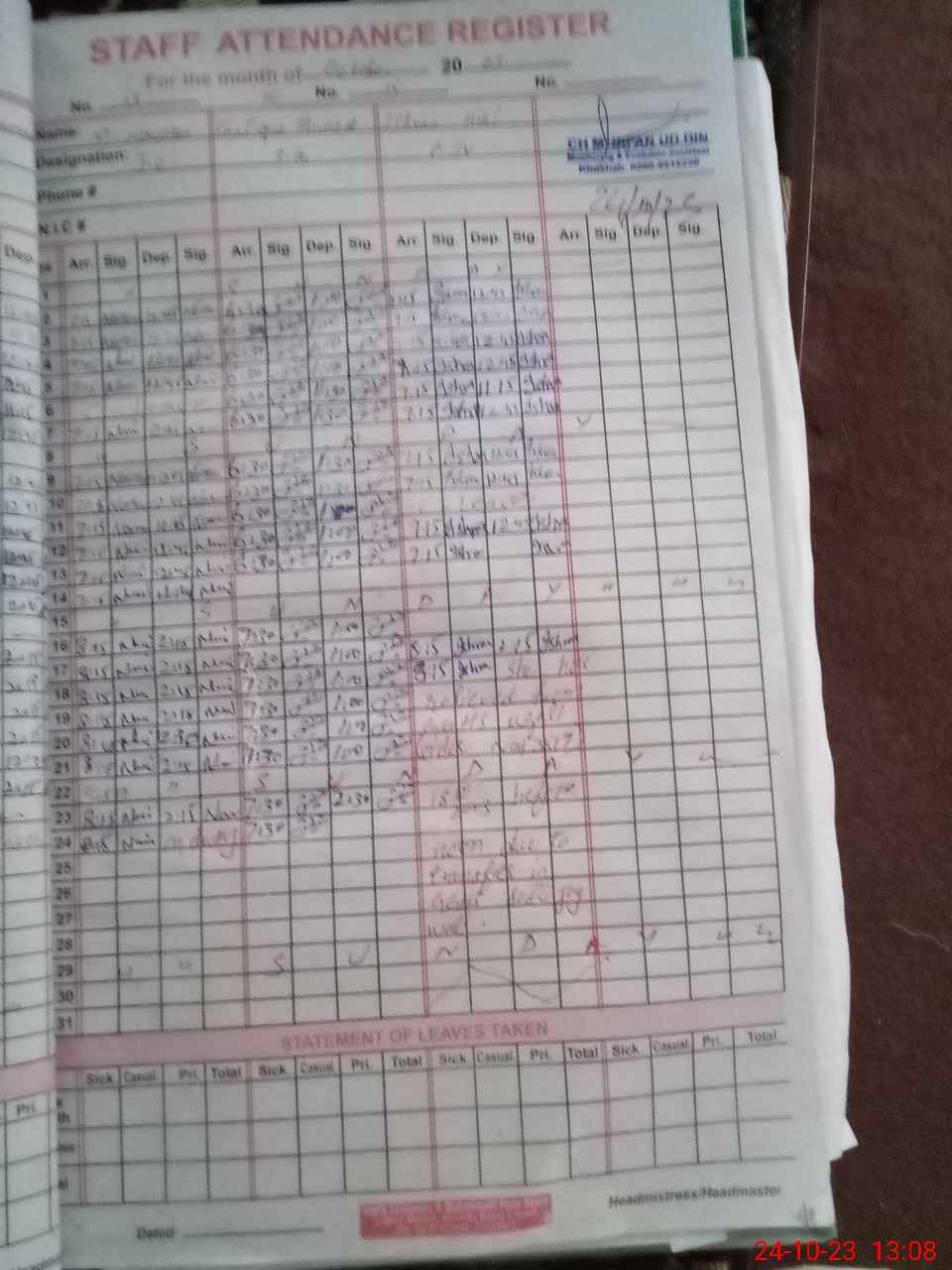 | CNIC | Full Name | Designation | R/C | Absence During Last Calender Month |