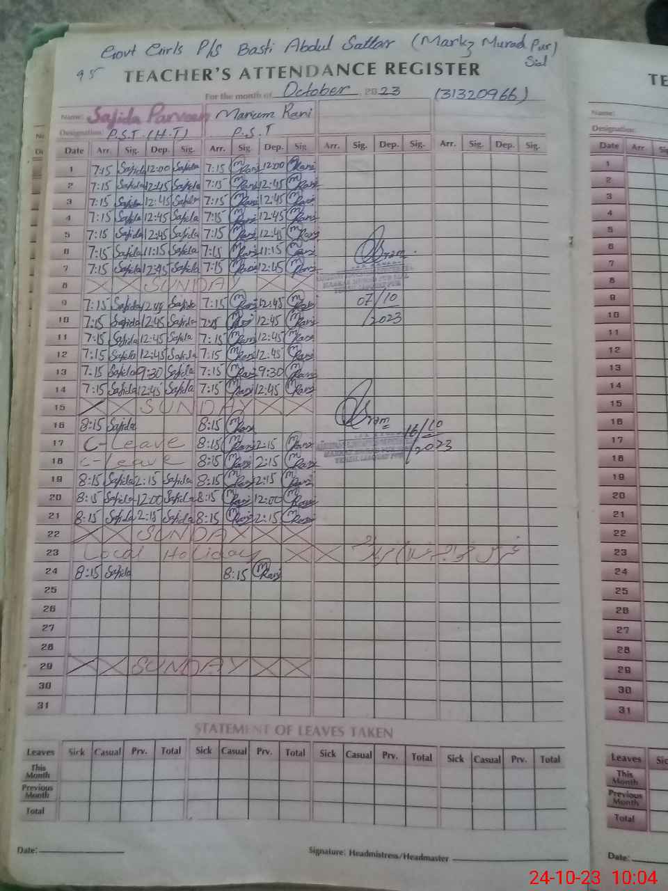| Name: Sa**** Pe**** Designation: (School Headmaster's/Headmistress's) PST Phone/Cell Number: 03**** |