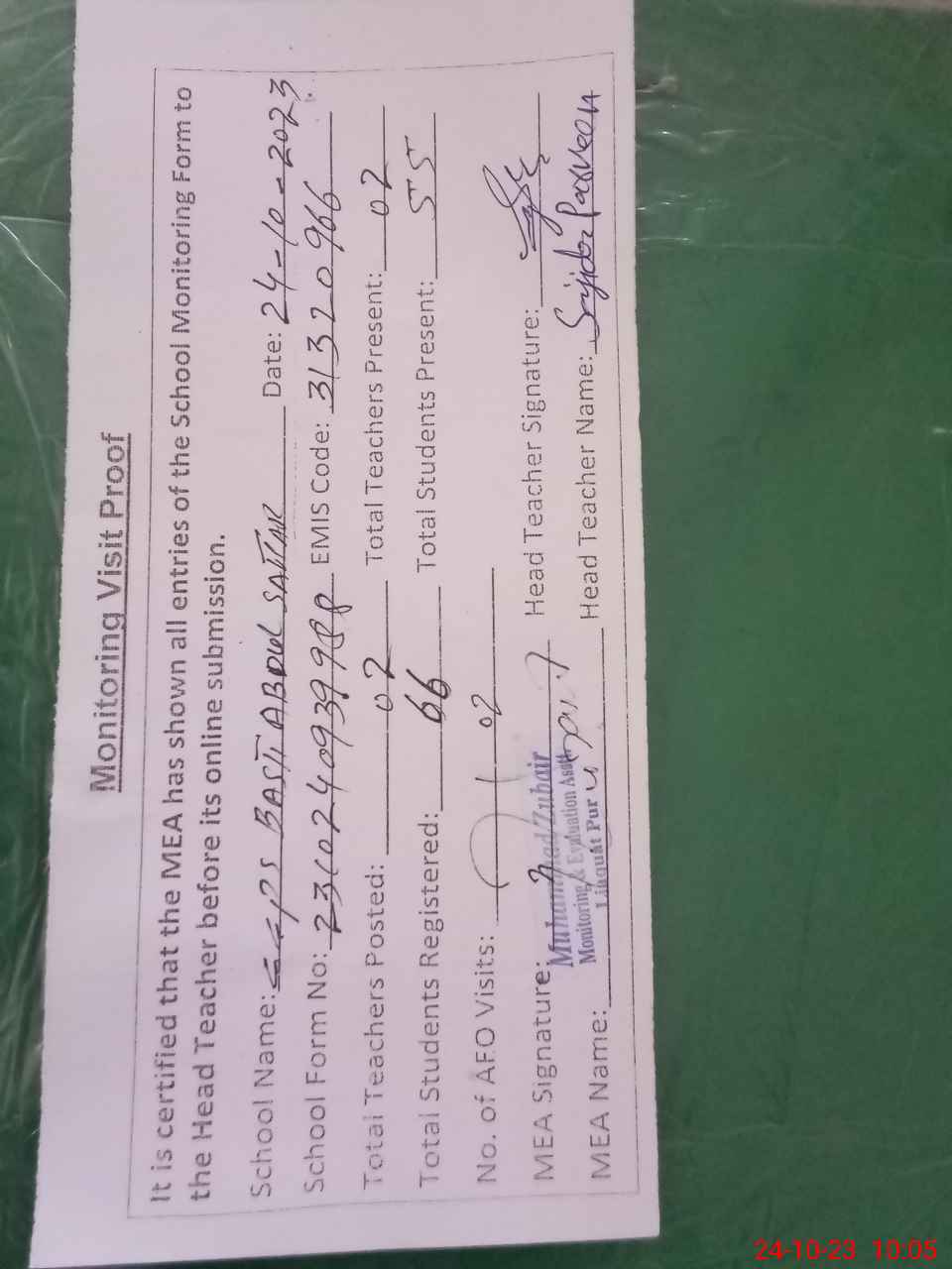 | Attendance Register | Head Teacher | MEA with School | Visit Proof |