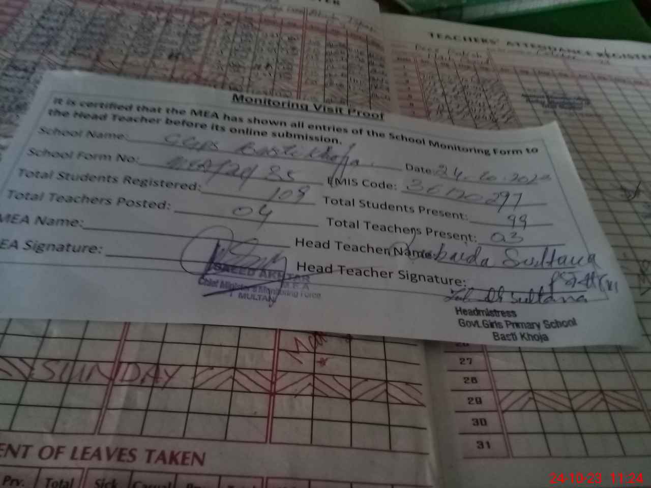 | Attendance Register | Head Teacher | MEA with School | Visit Proof |