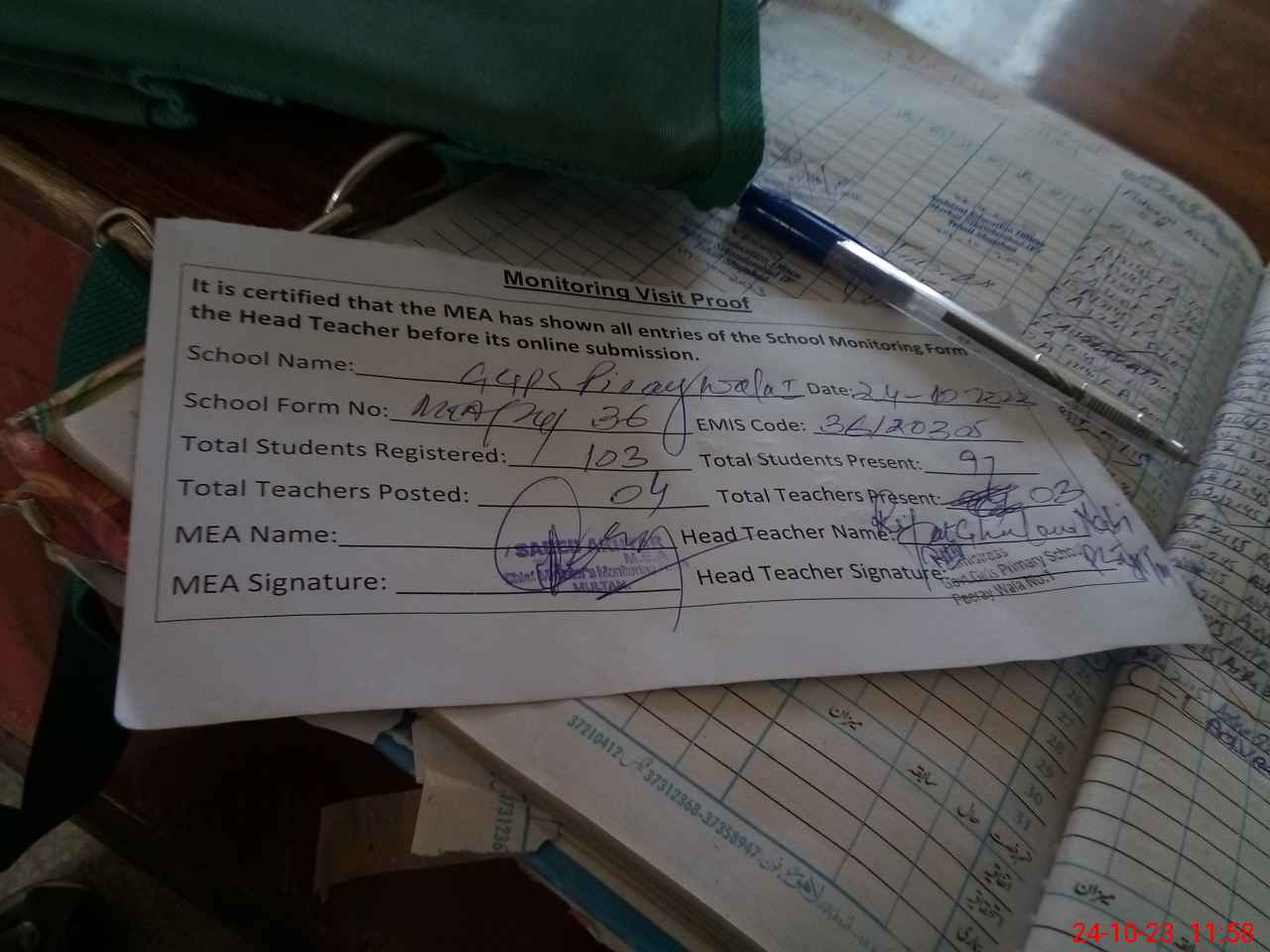 | Attendance Register | Head Teacher | MEA with School | Visit Proof |