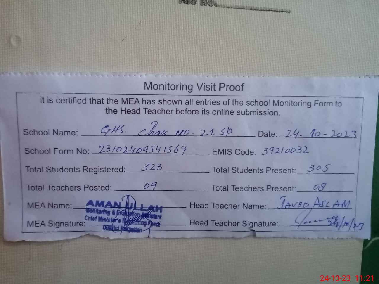 | EMIS Code: 39210032 | Name of School: GHS CHAK NO. 21/SP | |||