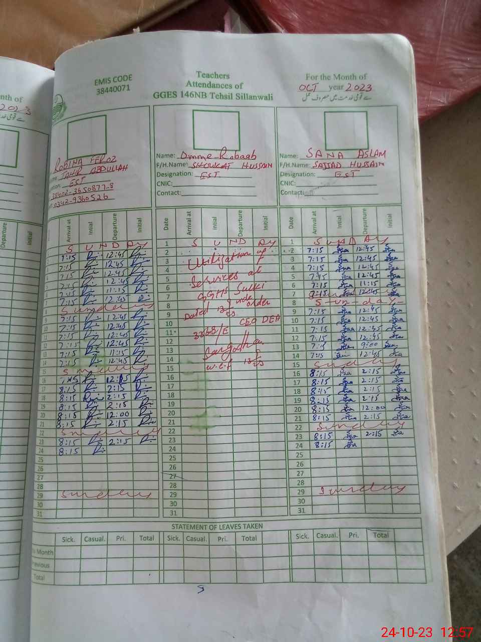 | Remarks (Use Separate Page if Required): EST omme rubbab is on temporary duty from this school To GGHSS sulki teh sahiwal wef 13 09 2023 | |||||