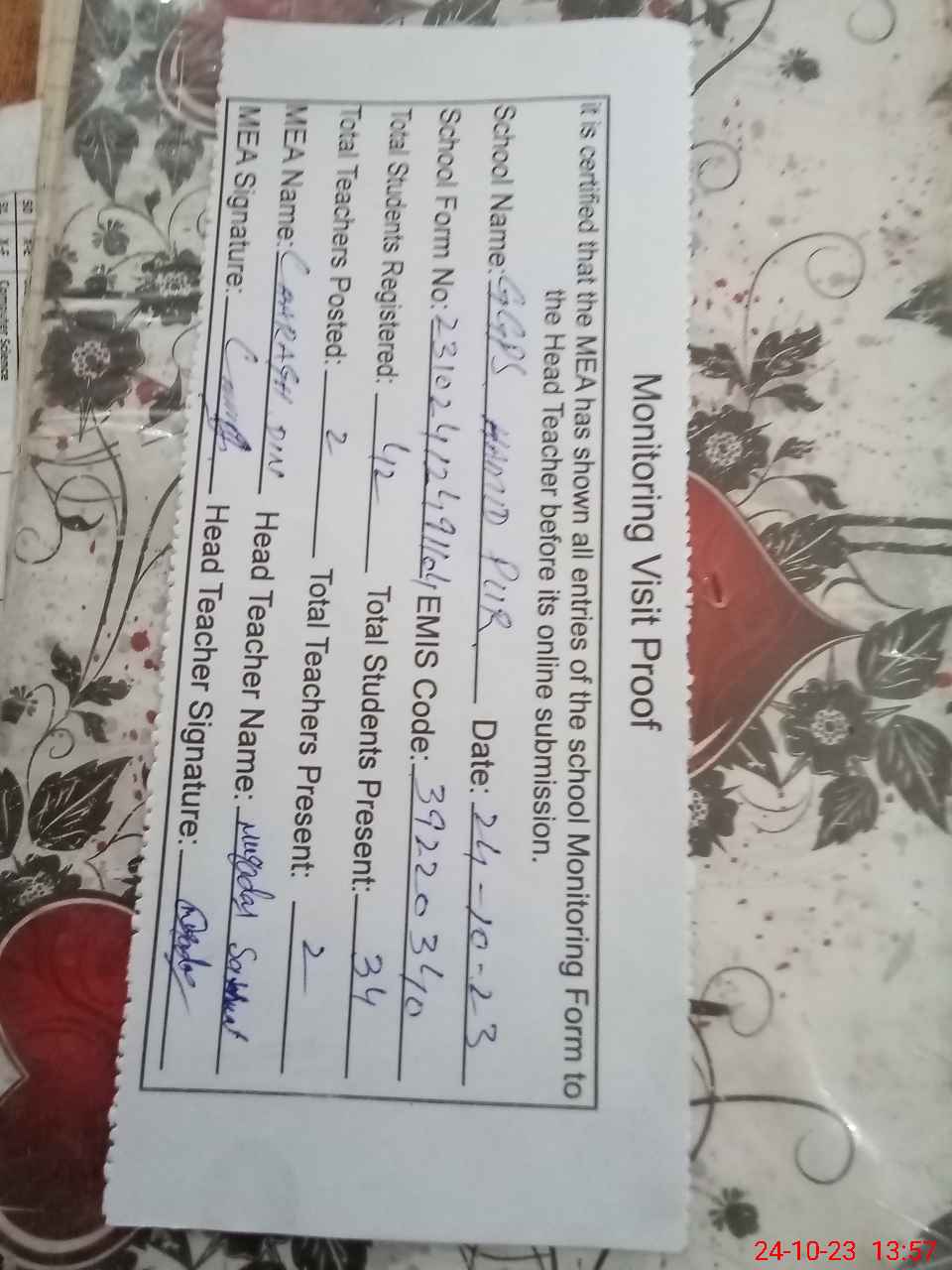 | Attendance Register | Head Teacher | MEA with School | Visit Proof |