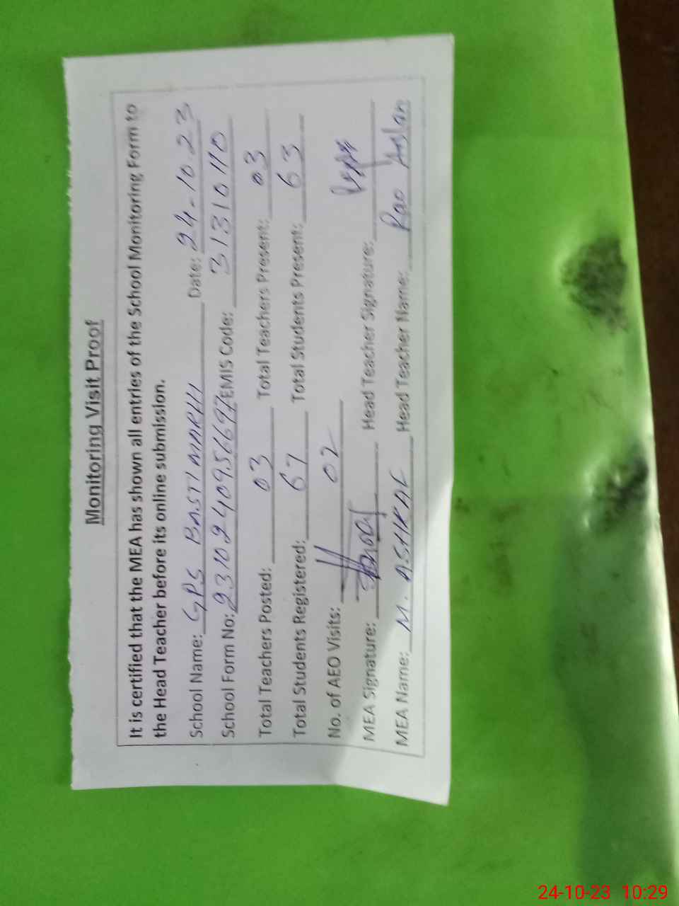 | Attendance Register | Head Teacher | MEA with School | Visit Proof |