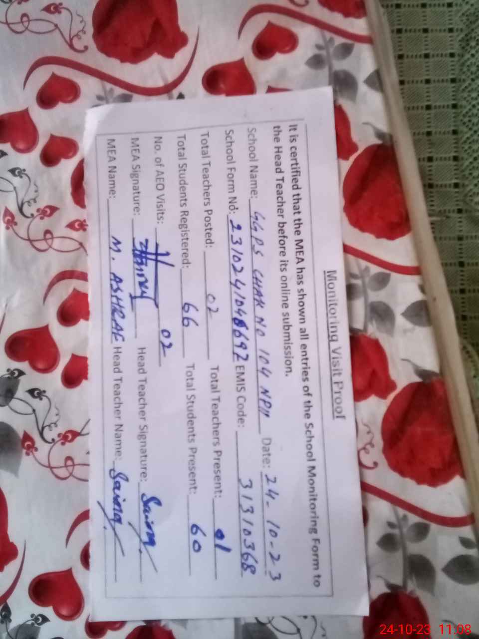 | EMIS Code: 31310368 | Name of School: GGPS CHAK NO.104/NP-II | |||