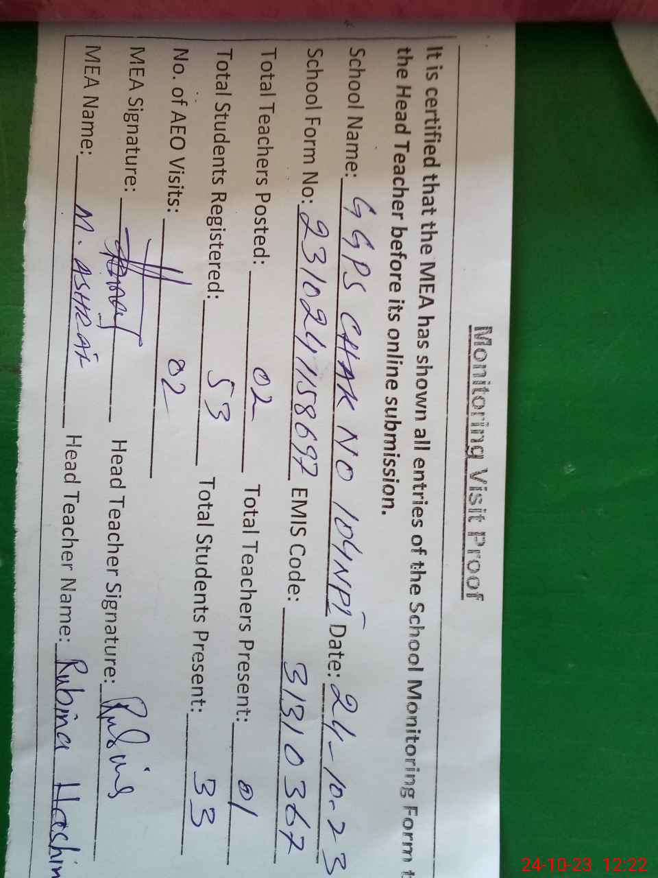 | Attendance Register | Head Teacher | MEA with School | Visit Proof |