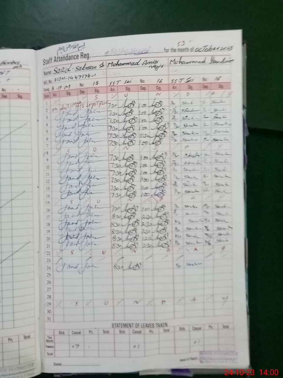 | CNIC | Full Name | Designation | R/C | Absence During Last Calender Month |