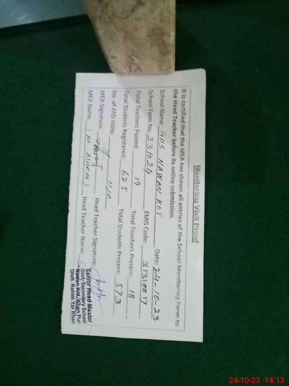 | Certified that this School was Inspected by the Undersigned MEA/DMO Today and the Information Stated Above is as Per Record. | |||||