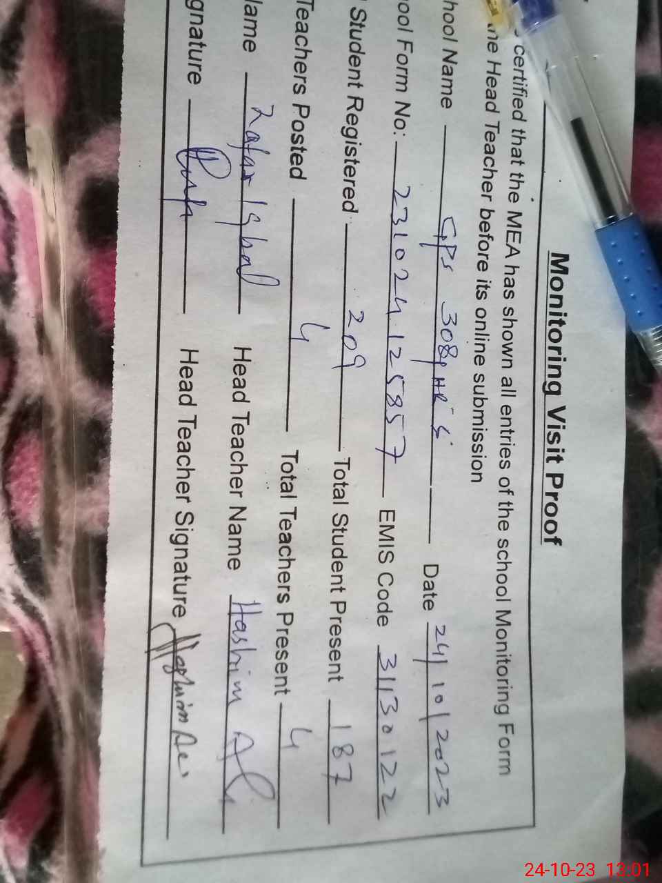 | Name: Ha**** Al**** Designation: (School Headmaster's/Headmistress's) PST Phone/Cell Number: 03**** |