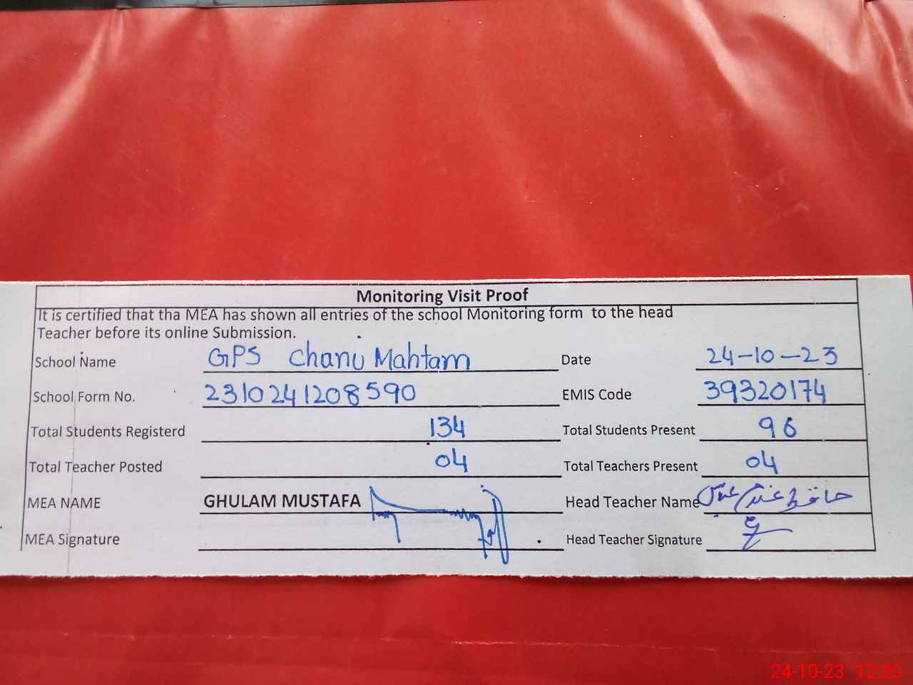 | Attendance Register | Head Teacher | MEA with School | Visit Proof |