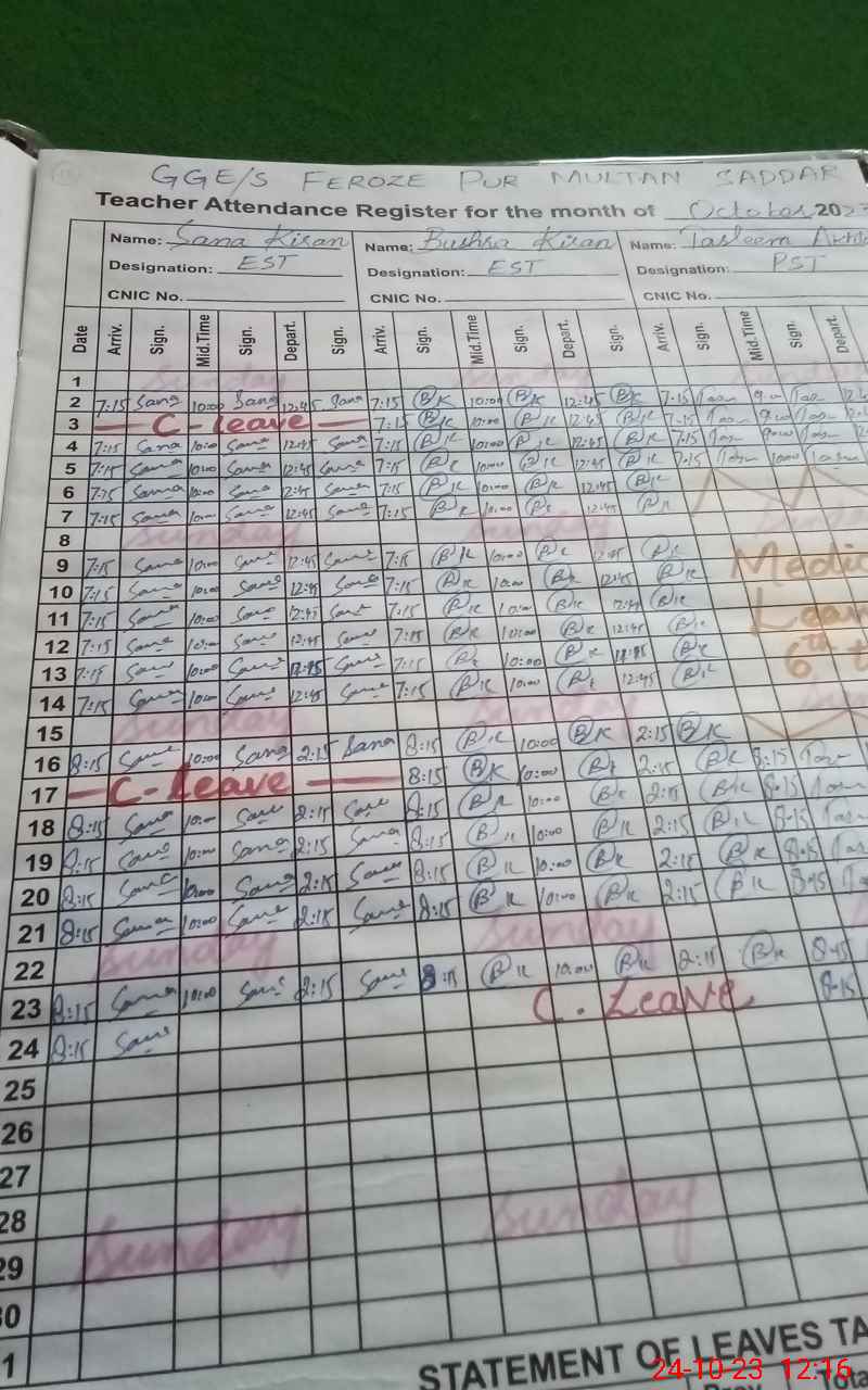 | CNIC | Full Name | Designation | R/C | Absence During Last Calender Month |