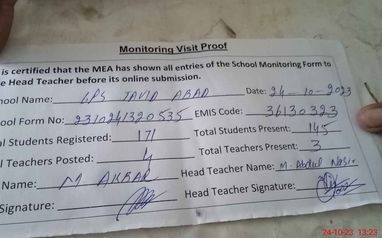 | EMIS Code: 36130323 | Name of School: GPS JAVED ABAD P/O SIKANDARABAD MULTAN | |||