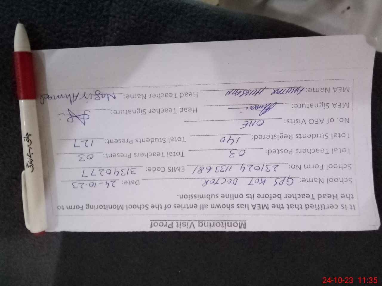 | Attendance Register | Head Teacher | MEA with School | Visit Proof |